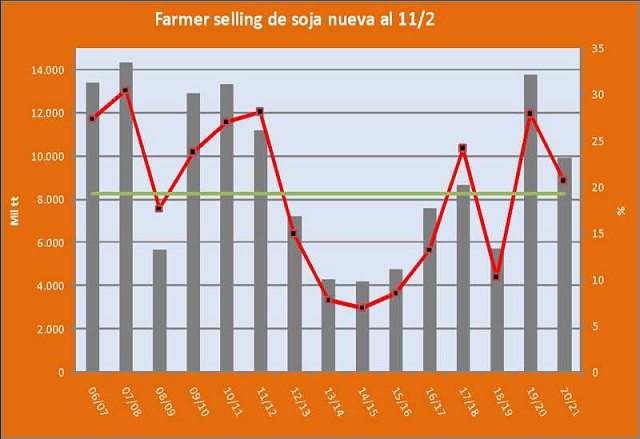 Más allá de este brusco recorte en comparación a lo verificado doce meses atrás, debemos recordar que en la campaña 19/20 la comercialización se ha acelerado inicialmente con el propósito de evitar la suba de retenciones que finalmente se aplicó en diciembre tras el cambio de gobierno (algo que dicho sea de paso resultó infructífero, tomando en consideración que tras las elecciones primarias de agosto de 2019 los precios de la campaña siguiente ya incorporaban una alícuota del 30% sobre los derechos de exportación de la soja).