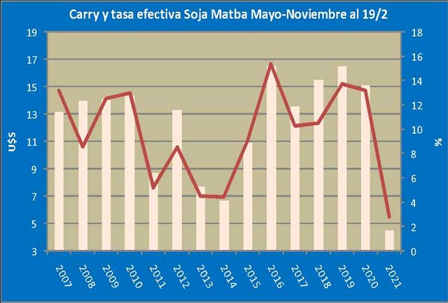 Por su parte, mirando estrictamente la plaza doméstica de soja a través de los diferenciales entre las distintas posiciones, la rentabilidad de postergar la comercialización después de cosecha resulta insignificante siguiendo la evolución histórica (y no debería sorprender que mayo se ponga más caro que noviembre en caso de que asistamos a un panorama todavía más escaso en EEUU); esto constituye un factor de peso para desprenderse de las existencias a comienzos del año comercial.
