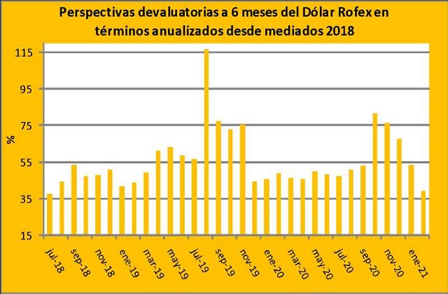 En este sentido, al analizar la tasa a 6 meses del dólar Rofex en términos anualizados, se advierte que estamos en niveles del 39% (tal como queda expresado en el gráfico 2; piso desde julio de 2018 y menos de la mitad del 82% registrado en octubre pasado). Esta tasa por el momento desincentiva el traslado de los negocios después de la trilla, toda vez que resulta altamente probable que se ubique por debajo de la inflación de 2021 (de hecho el Relevamiento de Expectativas de Mercado que informa mensualmente el Banco Central anticipa un aumento generalizado de precios para este año del 50%).