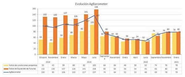 El nuevo informe indica que el crecimiento en la confianza de los productores se detuvo y los números reflejan una medición muy similar a la previa: El Ag Barometer Austral de este primer mes de 2021 tiene un valor de 79 frente a 78 de noviembre 2020 y de 52 en su medición interanual de enero 2020.