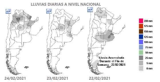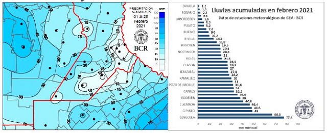 La media mensual de los últimos 30 años indica que la región suele recibir en febrero entre 100 a 120 mm con un claro gradiente a favor del este. Pero el promedio de las 36 estaciones de la región acumularon a la fecha tan solo 25 mm. Los mayores acumulados mensuales se registraron en el oeste cordobés y NE bonaerense.