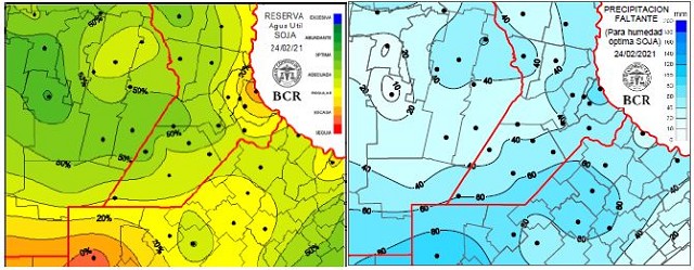 Es extremadamente variable la situación de la soja, tal como muestra la reserva de agua útil para soja de primera al 24 de febrero. El este de Córdoba y la franja este de Santa Fe están muy bien. Allí, pese a la tremenda falta de agua de febrero, la soja está necesitando tan solo entre 10 a 40 mm como se observa en la salida del modelo que grafica la falta de agua para la oleaginosa en pleno llenado (imagen derecha). Las sojas más afectadas están en el extremo sur y la franja oeste de Santa Fe y en el norte Buenos Aires, en especial el oeste. Allí, la necesidad de agua del cultivo trepa de los 40 a los 100 mm. La condición del cultivo en la región núcleo muestra que un 40% del área está en condición excelente a muy buena, un 30% regular a malo y en medio, un 30% que por ahora está bueno pero con muchas dudas. Al respecto de los lotes buenos (70% del área) en Pergamino, los técnicos dicen que “están bien, la condición varía mucho según la calidad de cada lote, rotaciones, manejo, cantidad de lluvias que recibieron. Están aguantando bien, en pleno llenado, ¿Pero cuál que va a ser el impacto? No se puede saber, con 10 días por delante sin agua… Súmale trips, arañuela y bolillera. Hay una gran incertidumbre”. En la franja del oeste de Santa Fe un agrónomo que recorría hoy la zona, decía: “la soja en campos buenos ha perdido un 10% de su potencial. En campos intermedios un 20 a 25%. En campos regulares un 40 a 50%. Esto es hoy (25/2), hay que ver cómo llegan al día de la próxima lluvia”. En General Pinto, ya hay casos donde estiman pérdidas del 50%. “Pero todo es muy variable según cada lote”, concluyen.