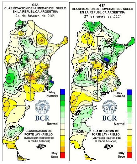 En principio, la soja de soja puede bajar de 2 a 10 quintales su rinde ante los pronósticos de escasas lluvias para los próximos 10 a 15 días. La soja de primera transita el periodo crítico de llenado con zonas donde se evidencian severos problemas de estrés hídrico y otros que casi no dan cuenta de la falta de agua, a pesar de lo ajustadísimo que ha resultado febrero. Por ejemplo, En Monte Buey, Córdoba, tras los 200 mm de fines de enero dicen: “si no llueve en 20 días va a terminar en un 80% del rinde esperado”, agregan. Los rindes estimados al momento son de 40 a 45 qq/ha”. En El Trébol y Carlos Pellegrini, “podría faltar agua para el llenado de granos”, pero estiman 45 a 50 qq/ha. Ya entrando en el oeste, en Cañada Rosquín, la falta de agua se agudiza: “las reservas hídricas de enero se terminaron”. Calculan que la soja de primera podría terminar con un 70% de su potencial. En Cañada de Gómez, “en los monitoreos