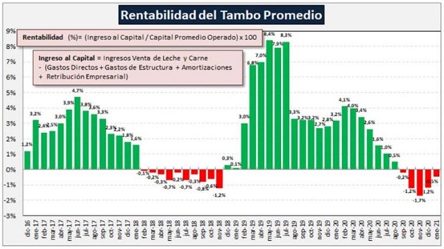 Por quinto mes consecutivo la rentabilidad del tambo promedio arroja una tasa de rentabilidad negativa, luego de 21 meses con valores positivos. Cabe aclarar que hay algunas regiones con rentabilidad negativa en los últimos 7 meses.
