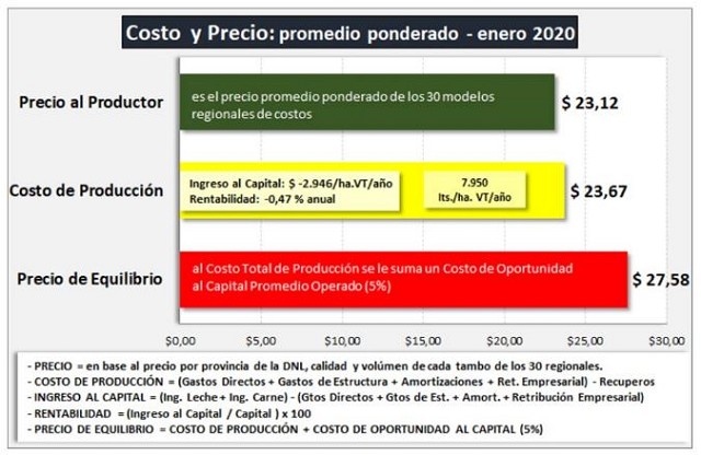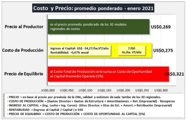 Si suponemos una tasa de rentabilidad exigida al capital del 5%, se debería generar un Ingreso Neto por hectárea que dividido por los 7.950 litros de leche de productividad promedio, deberían generar un valor de costo de oportunidad al capital promedio operado de $ 3,91/litro de leche. Por lo tanto, el Precio de Equilibrio sería en este supuesto de $ 27,58/litro de leche ($ 23,67 de Costo Total + $ 3,91 de Rentabilidad al Capital), unos US$ 0,321/litro.