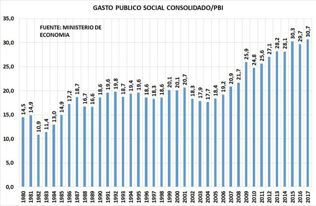 Si miramos el gasto público social consolidado, incluyendo salud, educación, pensiones, cultura, ciencia y técnica y demás rubros, nos vamos a encontrar con que en 1980 ese gasto representaba el 15% del PBI y en 2017 (último dato disponible del Ministerio de Economía) representaba el 30% del PBI. Es decir, se duplicó el gasto social y cada vez tenemos más pobres, indigentes, desocupados, peores hospitales y educación.