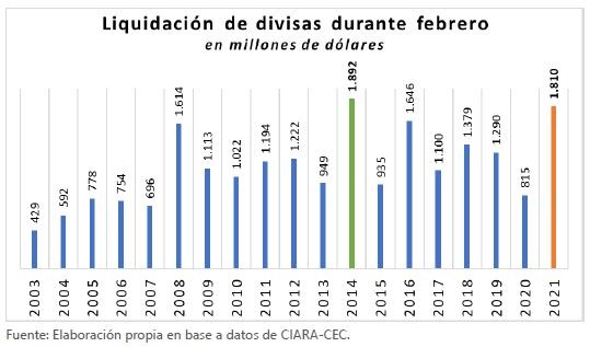 De mantenerse este escenario de precios, se espera que la liquidación de divisas continúe por encima de los registros previos para todo el 2 021. Los mayores precios permitirían compensar la caída de las cantidades , ocasionada por una sequía que impacta sobre el periodo crítico de llenado de granos de los cultivos gruesos El resultado final dependerá del dinamismo que adquieran las ventas de los productores. De acuerdo a nuestras estimaciones, en 2021 se liquidarían divisas por USD 28.800 millones, superan do en un 38% a lo liquidado en 2020.