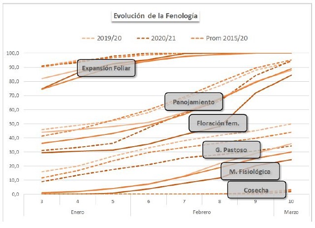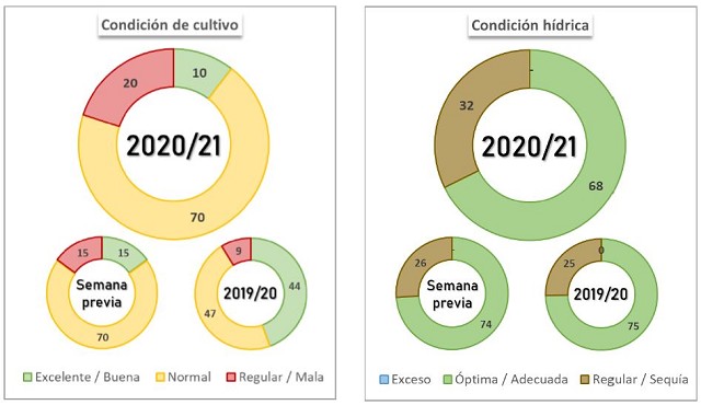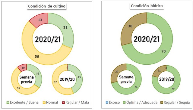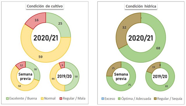 La ausencia de precipitaciones afecta la condición hídrica del maíz. Al presente informe, la condición Óptima/Adecuada perdió siete puntos porcentuales que pasaron a incrementar la condición Regular/Sequía.