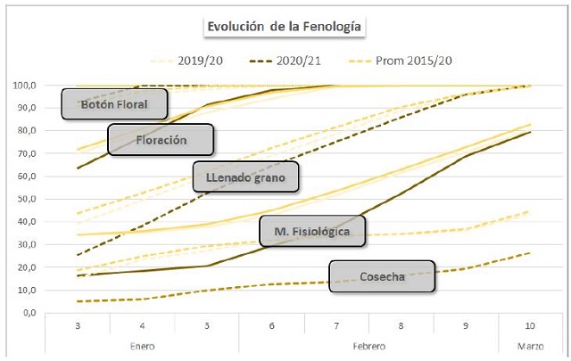 La cosecha de girasol alcanzó el 26,3 % del área estimada a nivel nacional, registrando un avance intersemanal de 7 puntos porcentuales. El 86,4 % del área en pie mantiene condición normal a buena, con lotes que relevaron condición hídrica adecuada a óptima en el 70,2 % de los casos. Con respecto a la fenología del cultivo, el 79,5 % del girasol ya alcanzó el estadio de madurez fisiológica. Por otro lado, en el Sudeste de Buenos Aires se registraron granos livianos en los lotes trillados, producto de enfermedades causadas por hongos tales como verticillium y phomopsis, lo que podría impactar causando mermas en el rendimiento final.