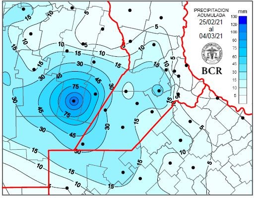 Lo bueno es que se dieron estando fuera de pronóstico; lo malo, que fueron lluvias extremadamente irregulares. En el este fueron menos de 5 mm y solo el sur Córdoba y parte del sur de Santa Fe recibieron más de 15 mm, dejando un milimetraje muy importante en Canals — 110 mm— o Monte Maíz con zonas de 180 a 200 mm aunque con fuertes eventos de granizo. En General Pinto se registró 12 mm pero los técnicos dicen que les cuesta recordar algún otro evento de lluvias con semejante variación espacial. “Un lote, a 500 metros de otro, recibió 40 mm. El otro cero”, comentan.