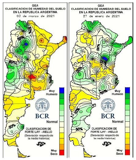 En los departamentos de Marcos Juárez y Unión la situación es muy diferente, sobre todo en el sur que esta semana recibió lluvias que superaron los 30 mm. La zona de Monte Maíz recibió entre 180 a 200 mm y hay una mejora sustancial en la condición de todos los cultivos, incluso pasaron a tener buenas reservas de humedad. En el sur de Santa Fe, las zonas más mediterráneas están mejor, con 30 a 15 mm recibidos. Pero también se tratan de áreas que venían con mayores reservas. Y recién en esta semana comenzaban a notarse “manchones de estrés” en sojas de segunda, como en El Trébol o Carlos Pellegrini, que siguen apuntando a muy buenos rindes. En Bigand comentan que se pueden obtener rendimientos de 30 a 32 qq/ha.