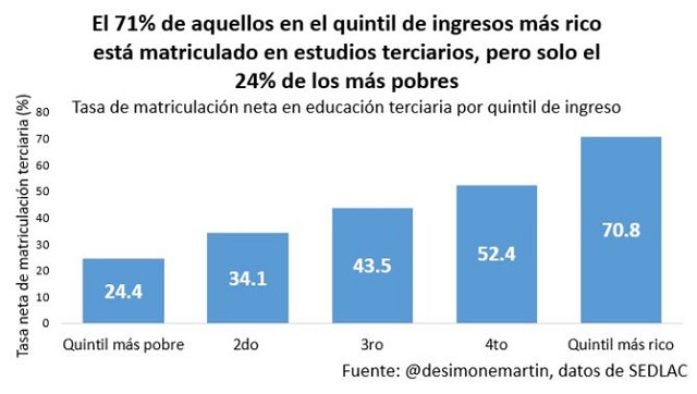 Otro de los grandes problemas en relación con nuestra educación superior es el alto grado de desigualdad. Mientras que el quintil más rico de la población muestra una tasa de matriculación en educación superior mayor al 70%, el valor es menor al 25% para el quintil más pobre. Las diferencias serían aún más pronunciadas si pudiéramos ver los datos de graduaciones.