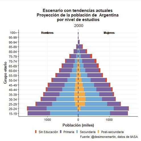 Esto se debe principalmente a que la evolución de la población de un país está íntimamente ligada a los niveles de acceso a la educación. Existe una amplia literatura que muestra que los países en los que existe mayor acceso a la educación por más años -especialmente para las mujeres- tienden a tener tasas de natalidad mucho más bajas. Esto también ocurre al interior de los países: aquellos grupos que acceden a menor educación tienden a tener familias más numerosas. Para tener en cuenta estas intrincadas dinámicas vamos a usar los datos del International Institute for Applied Systems Analysis (IIASA)[2], una organización altamente respetada basada en Viena que, entre otras cosas, realiza proyecciones de población que, a diferencia de las proyecciones de las Naciones Unidas, toman en cuenta los niveles de educación de la población.