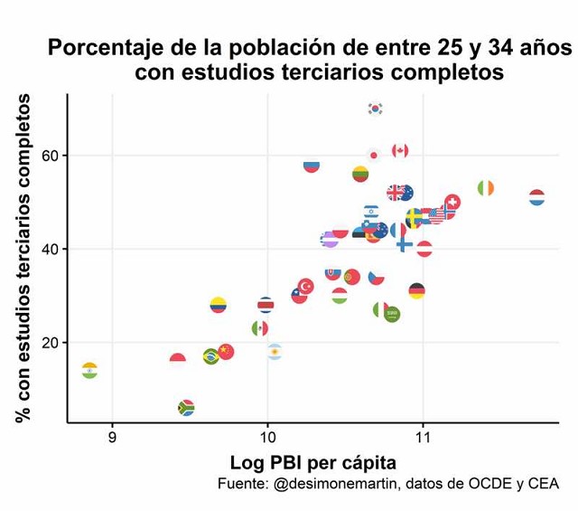 Solo un 18% de la población argentina de entre 25 y 34 años tiene estudios terciarios completos. El valor es similar al de Brasil (17%) pero mucho más bajo que el de países como Colombia (28%), Chile (30%) y los países europeos. Este valor incluye tanto terciarios cortos como licenciaturas, títulos de grado y aquellos que tienen posgrados como maestrías y doctorados.