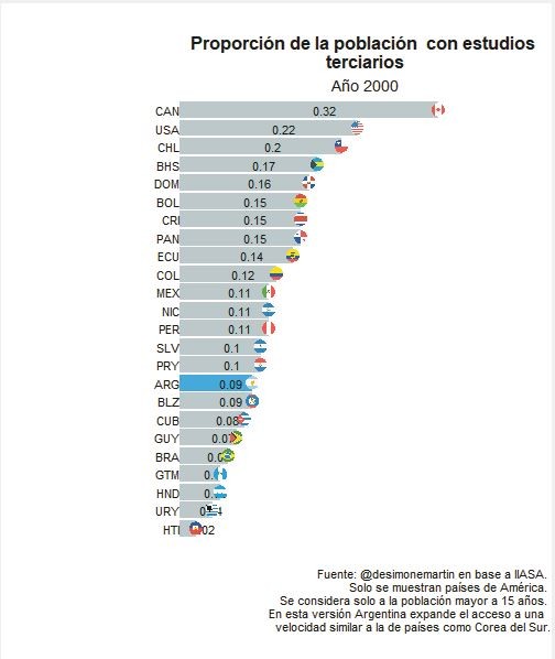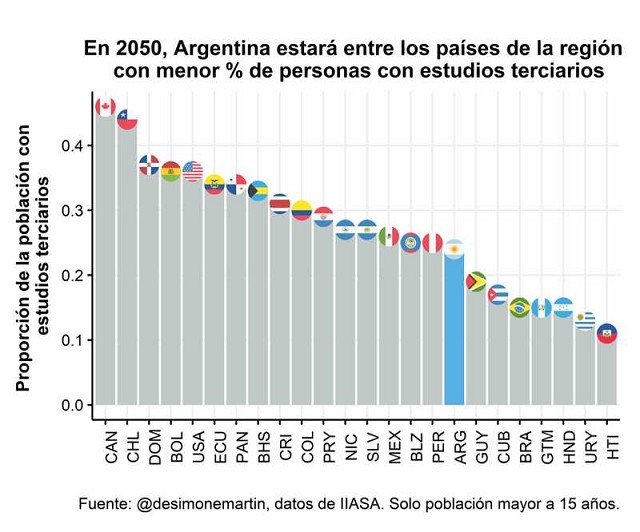 Esto ubicará a la Argentina solo por delante de unos pocos países en la región, tales como Haití, Uruguay, Honduras, Cuba y Brasil. Por su parte, Chile tendrá un desempeño tal que lo pondrá casi al tope de la lista, con más del 40% de su población con estudios terciarios y por encima de los Estados Unidos. Otros países como Bolivia, Ecuador, Colombia y Paraguay tendrán un porcentaje de su población con estudios terciarios mucho mayor al de Argentina.