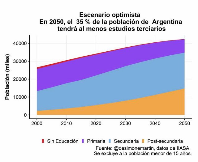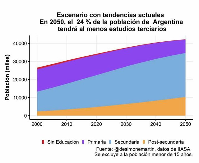 Si tomamos las proyecciones del IIASA, vemos que, si se mantienen las tendencias actuales, en 2050 solo el 24% de la población mayor de 15 años de Argentina tendrá estudios terciarios[3]. El 58% tendrá estudios secundarios, el 18% tendrá estudios primarios y casi nadie no habrá accedido a ningún nivel de educación.