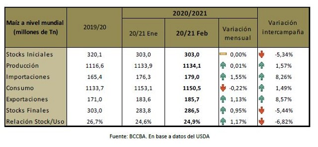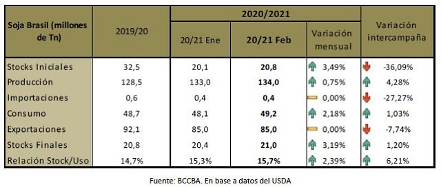 Con la cosecha avanzando en Brasil, el USDA estima la producción 2020/21 en 134 millones de toneladas, un millón de toneladas más que en el reporte de febrero. Este volumen representa 900.000 toneladas más que lo que esperaba el mercado. Para Argentina se estima una cosecha de 47,5 millones de toneladas, igual cifra a la del informe previo y en línea con lo esperado.