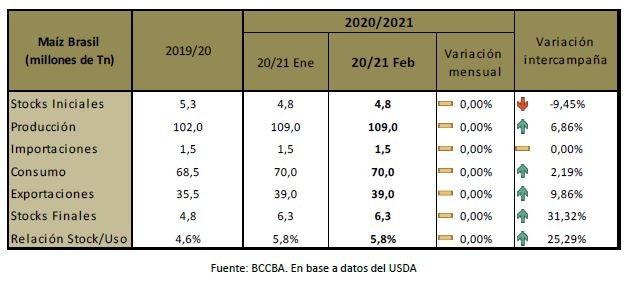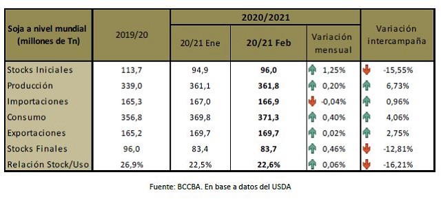La producción en Brasil para la campaña 2020/21 se estima en 109 millones de toneladas, 900.000 toneladas por encima de lo esperado por el mercado. Para Argentina, la cosecha sería de 47,5 millones de toneladas, cuando los privados esperaban un volumen más bajo (47 millones de toneladas).