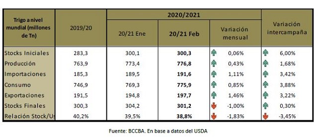 En trigo, la producción de la campaña 2020/21 sería de 776,8 millones de toneladas, lo cual representa un aumento respecto al informe previo, en el orden de las 3,4 millones toneladas. En relación con los stocks finales globales del ciclo 2020/21, los mismos alcanzarían los 301,2 millones de toneladas, con un recorte de 3 millones de toneladas respecto a febrero y 3,1 millones de toneladas por debajo de lo estimado por privados (304,3 millones de toneladas). Los stocks finales de Estados Unidos se proyectan en 22,8 millones de toneladas, en línea con lo esperado por el mercado.