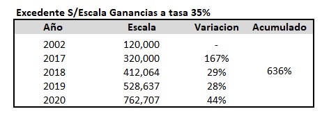 En principio, hay que recordar que en 2017 la escala se actualizó, pero de una manera desfasada con respecto a la inflación acumulada en los 15 años anteriores. Y de allí en adelante, se utilizó el indicador de Remuneración Imponible Promedio de los Trabajadores Estables (Ripte), que también distorsiona el cálculo, porque está desfasado un año entre su aplicación y el pago del impuesto.