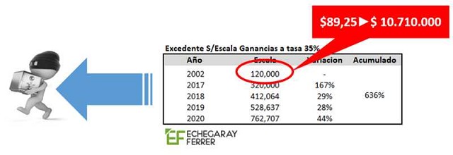 Una manera práctica de analizar el efecto que tiene esta falta de actualización de las escalas, es observar que para acceder a la tasa máxima del impuesto en 2002 había que tener ganancias superiores a 120.000 pesos o su equivalente en dólares (todavía regía el 1 a 1).