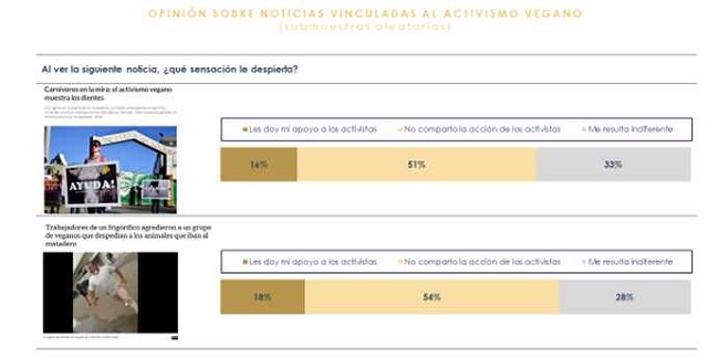 De la misma manera y para captar el humor social ante situaciones donde el activismo vegano despliega su acción en los ámbitos de la producción y comercialización de la carne, cuando se muestra a la gente dos noticias relacionadas con estas acciones, presentadas incluso de distinta manera en relación al grado de victimización y perjuicio de los distintos actores involucrados, claramente la gente no está a favor de apoyar estas acciones concretas.