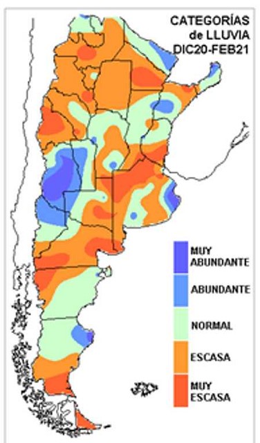 Como podemos ver, parecen áreas restringidas del sur de sudeste de CB, donde la performance pluvial fue normal o puntualmente algo sobrada. También se detectan corredores en la provincia de BA donde las lluvias fueron normales. Debe quedar claro, que la normalidad meteorológica de las lluvias para todo este período, no implica que las zonas donde esto se dio no hayan “sufrido” agronómicamente, el mes de febrero.