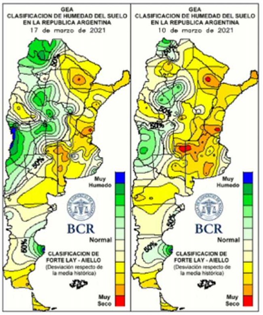 Las imágenes de la anomalía de reserva de agua en el suelo de hoy, miércoles 17 de marzo, y la de hace solo siete días atrás son contundentes y muestran el cambio favorable de escenario.