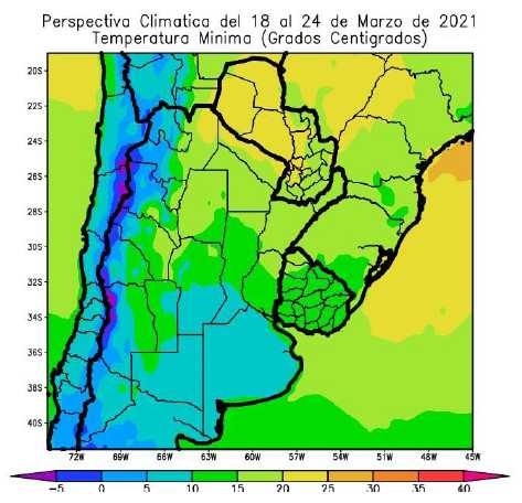 El este del NOA, la mayor parte de la Región del Chaco, el norte y el centro de la Mesopotamia, el sudeste del Paraguay, el norte de Santa Fe, el norte de Entre Ríos, el noroeste de Córdoba y el noroeste del Uruguay observarán temperaturas mínimas superiores a 15°C, con focos con valores superiores a 20°C y otros focos con valores inferiores.