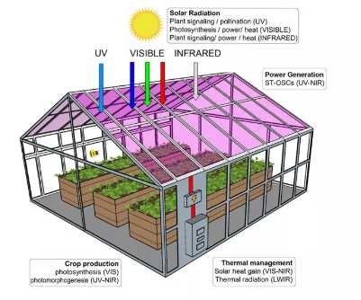 Debido a que las plantas no usan todas las longitudes de onda de la luz para la fotosíntesis, los investigadores han explorado la idea de crear células solares orgánicas semitransparentes que absorben principalmente longitudes de onda de luz de las que las plantas no dependen, e incorporar esas células solares en invernaderos.
