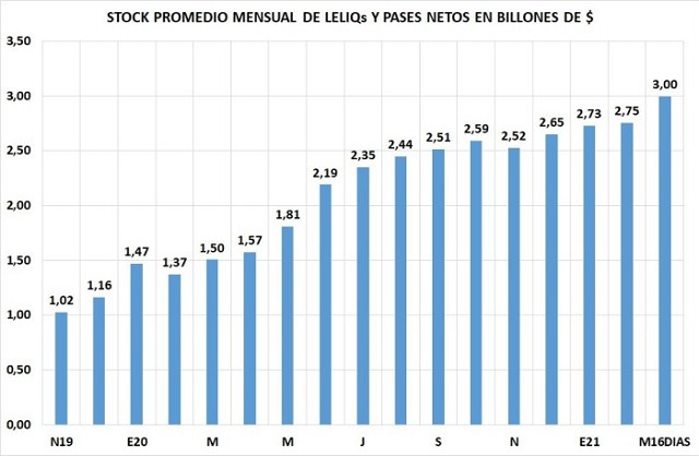 Como puede verse en el gráfico 1, el stock de LELIQs y Pases Netos sumaba al 16 de marzo era de $ 3 billones, con lo cual el sector público se está quedando con el 44% del total de los depósitos del sector privado en el sistema financiero, desplazando al sector privado de ese mercado. Adicionalmente, cabe destacar que en noviembre de 2019, último mes completo del gobierno de Macri, le dejó a Alberto Fernández un Banco Central con un stock de LELIQs y Pases de $ 1 billón. En otras palabras, en los 15 meses y medio que lleva de gobierno, el presidente Alberto Fernández multiplicó por 3 el stock de LELIQs.