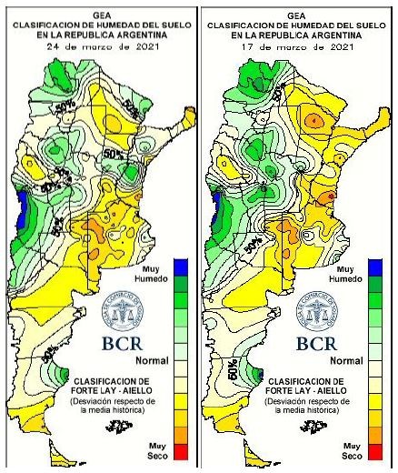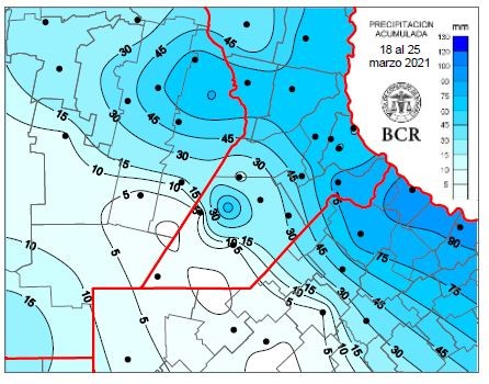 Las lluvias acumuladas del jueves 18 hasta el jueves 25 (hasta las 8:00 a.m.) rompieron con el patrón que privilegiaba al oeste. La franja este recibió de 60 a 90 mm. Localidades como Ramallo y Baradero finalmente recibieron las lluvias adeudadas desde febrero en los primeros días del otoño: acumularon 96 y 94 mm, respectivamente. Pero para los cultivos fue demasiado tarde.