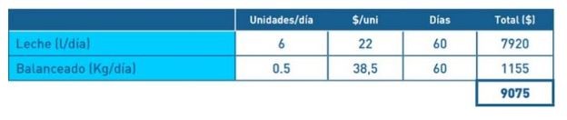 Como se detalla a continuación, para la dieta propuesta, el costo de alimentación en los 60 días de crianza, suma un total de 9075 $/ternera, donde la leche representa el 87 %.