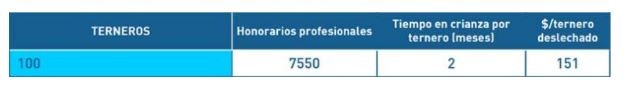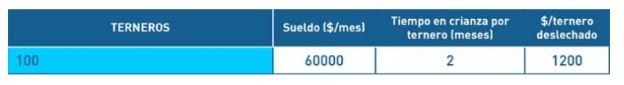 Se desarrolla a continuación un cálculo de costos), sobre una propuesta de manejo que no debe ser tomada como receta. En este ejemplo las terneras salen de crianza a la edad de 60 días, consumen 6 litros diarios de leche y 500 gramos de balanceado en el promedio de todo el período. Se considera que la cantidad promedio de terneras en crianza es de 100 animales los cuales están a cargo de una persona y el médico veterinario visita la crianza una vez al mes.