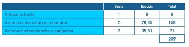 El manejo sanitario consiste en la aplicación de 2 dosis de una vacuna para diarrea neonatal a la vaca, desparasitación de la ternera al salir de crianza y 2 dosis de vacuna para mancha y gangrena. El gasto en veterinaria suma 237$/ternera.