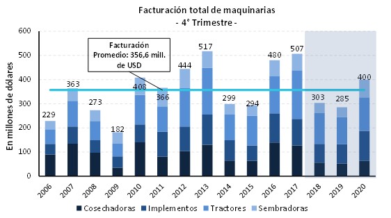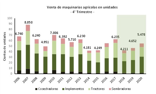 El desempeño de la industria al comienzo del año 2020 no tuvo una buena performance, en términos de maquinarias agrícolas vendidas el primer trimestre de 2020 reflejó una caída del 8% en comparación al primer trimestre de 2019. A pesar de esto, tanto en el segundo como en el tercer trimestre la industria logró recuperarse, y la venta de maquinarias creció un 36% y 23% respectivamente. Entre octubre y diciembre, se comercializaron 5.478 maquinarias, es decir, 826 unidades más que para el mismo período del año anterior. El rubro con el mayor crecimiento fue el de sembradoras, que presentó una suba del 35% con una venta de 656 unidades. Le siguieron los implementos que, con una suba del 26,7% llegaron a las 2.908 unidades vendidas en el trimestre analizado. Por otro lado, el rubro de tractores registró un aumento del 2,6%. Finalmente, la venta de cosechadoras cayó levemente en un 0,5% en el cuarto trimestre de 2020.