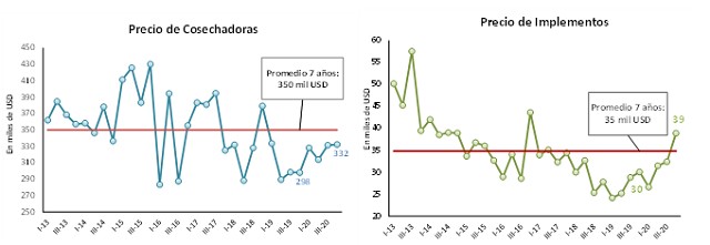 Esto último se puede analizar con más detalle en los dos gráficos a continuación. Los mismos muestran cómo a partir de 2018, tras la recaída del sector de maquinarias agrícolas, el precio en dólares comenzó a disminuir a causa de que los precios en pesos estaban prácticamente estables y la moneda local atravesaba una depreciación continua. Estos precios mínimos representaron un costo promedio de USD 298.000 por una cosechadora y USD 30.000 por un implemento hacia fines de 2019. Actualmente estos precios se ubican en USD 332.000 y USD 39.000 respectivamente.