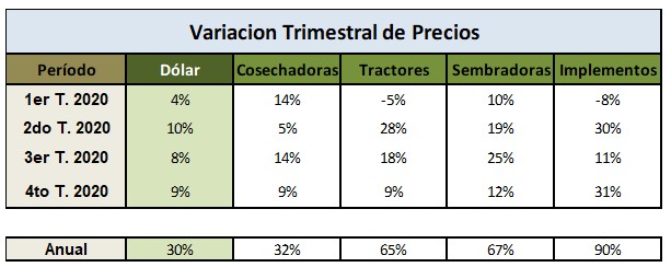 Si se compara la evolución de los precios de las maquinarias en pesos con el aumento del tipo de cambio oficial en el mismo período, puede observarse la recuperación que ha presentado la industria de maquinaria agrícola en el 2020. El incremento en los precios en moneda local fue mayor que la depreciación del peso, haciendo que el precio de las maquinarias en dólares comience a recuperarse. Durante el 2020, la depreciación del tipo de cambio fue del 30%, mientras que el rubro de maquinarias que registró el menor incremento de precios en pesos fue el de cosechadoras, con un 32%. Por otro lado, los implementos presentaron el mayor aumento de los precios en pesos, con una suba del 90%.
