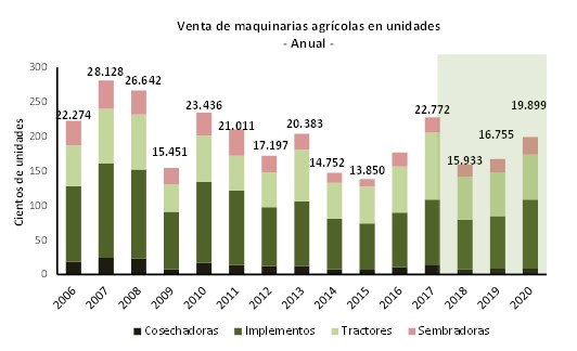 Analizando el acumulado para el año 2020, y sumando todos los rubros, las ventas de unidades de maquinaria agrícola creció un 18,7% respecto del año anterior. Acumulando 19.899 ventas, este año presenta el segundo mayor volumen vendido en los últimos siete años, y se mantiene por encima del promedio de los últimos diez años (18.517 unidades).