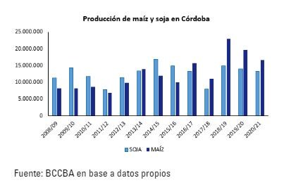 Por su parte, tal como se observa en el siguiente gráfico, cabe destacar que la provincia de Córdoba, desde la campaña 2016/17, viene reflejando una producción de maíz superior a la de soja. Para la campaña 2020/21, la producción de soja se ubica en las 13,2 millones de toneladas mientras que la de maíz sería de 16,7 millones de toneladas, es decir 3,5 millones de toneladas por encima de la oleaginosa.