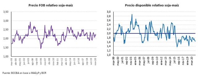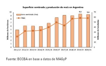 Uno de los cultivos más importantes en la producción agrícola argentina y con mayor diversidad de usos es el maíz. Se puede observar que desde la campaña 2014/15, el área sembrada del cereal se incrementó considerablemente hasta la campaña 2017/18, a partir de allí dicha variable ha presentado un comportamiento relativamente constante, entre 9,0 y 9,4 millones de hectáreas sembradas. La mayor superficie de maíz obedece a precios a nivel local relativamente más atractivos que los de la oleaginosa como consecuencia de los derechos de exportación vigentes.