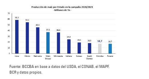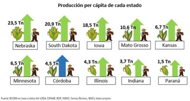 Si bien la producción de los estados del país norteamericano está menos concentrada, los mismos producen una cantidad ampliamente superior a las divisiones de los demás países. El primer puesto en el ranking de producción lo ocupa Iowa con 58,3 millones de toneladas seguido por Illinois, Nebraska y Minnesota. Estos 4 estados producen conjuntamente 136 millones de toneladas, más de 2 veces el volumen total de la producción argentina. Adicionalmente, estos estados que manejan volúmenes tan elevados, como Iowa o Nebraska, tienen una producción entre 18 y 25 toneladas por habitante, mientras que la producción per cápita cordobesa es de 4,5 toneladas. Mientras más baja sea la producción por habitante, menor la capacidad exportadora de la división ya que el consumo dentro de la provincia podría ser significativo, aunque depende en última instancia de cuánto maíz se consume geográficamente. Córdoba presenta una buena producción por habitante, ubicándose en el sexto puesto dentro del ranking de producción per cápita.