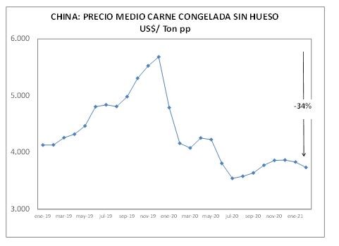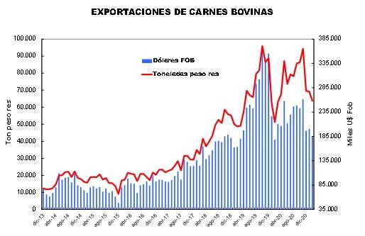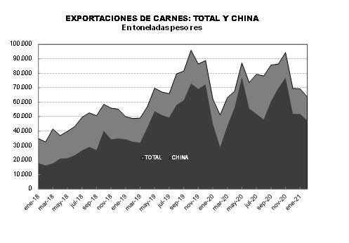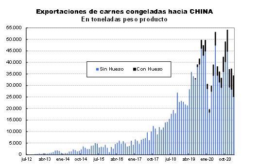 En el mes de febrero de 2021, las exportaciones de carnes congeladas alcanzaron 37 mil toneladas peso producto por valor de 136 millones de dólares. Fueron las más bajas desde marzo de 2020 e incluyeron una proporción creciente de carnes con hueso. China representó el 89% del volumen total de carnes congeladas y prácticamente la totalidad de las carnes con hueso.