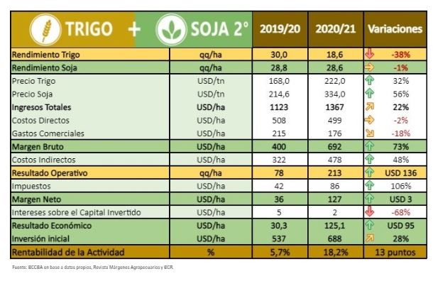 El margen bruto para la campaña 2020/21 alcanzó los USD 449/ha, representando un incremento del 105% respecto al ciclo previo.