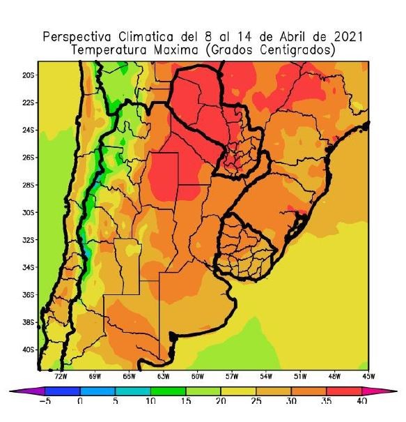 El este del NOA, el centro de Cuyo, la Región del Chaco, la mayor parte de la Mesopotamia, el norte de Santa Fe, el oeste de la Región Pampeana y la mayor parte del Paraguay observarán temperaturas máximas superiores a 30°C con un foco con máximas superiores a 35°C que se ubicará sobre el noroeste del Paraguay, con focos con valores inferiores.