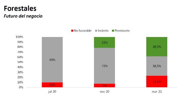La mayoría de las empresas CREA que se dedican a la actividad forestal planean mantener estable la inversión en podas y raleos. La opinión sobre cómo evolucionará la actividad forestal se encuentra dividida. Esto se refleja en los resultados de la encuesta, la cual arrojó que un 38,5% de los consultados proyecta que el futuro de la actividad es promisorio, otro 38,5% lo considera incierto y el restante 23,1% cree que es desfavorable.