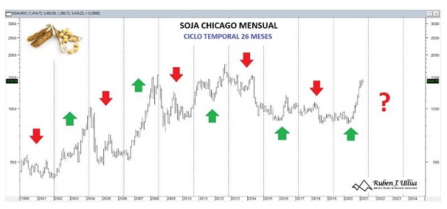 Este ciclo temporal, nos muestra cómo se han ido intercalando cada 26 meses periodos de bonanza para la soja y períodos de corrección.