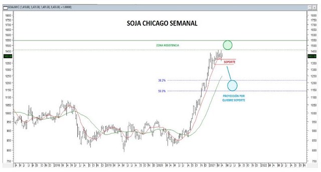 Mucho se ha hablado por estos meses sobre la posibilidad concreta que pueda tener la soja de retornar a sus valores históricos del año 2012, justamente apoyado por el fundamental alcista que trae este mercado. Sin embargo, desde lo técnico no vemos tan clara esta posibilidad, al menos en los próximos meses. Por el contrario, el avance en desarrollo para la soja enfrenta en la zona de 1450-1550 centavos una importante resistencia de mediano plazo, que ha sido testeada y reconocida con posteriores recortes en el precio, en varias oportunidades desde el año 2008 a la fecha.