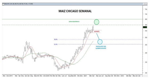 Es importante aclarar que estos objetivos de corrección sugeridos, no necesariamente vayan a darse para el contrato más cercano de mayo/21, sin embargo si es posible de esperar para los contratos de Julio en adelante. De hecho, no podemos obviar que el pase a nueva cosecha estadounidense es bastante negativo, lo cual se encuentra en línea con estas expectativas de corrección favorecidas para el precio del commodity.
