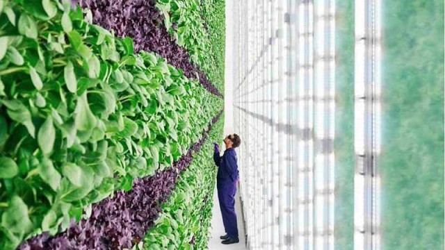 plantas verticales, iluminación LED y robots para plantar, cuidar y cosechar los